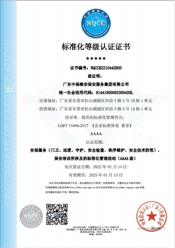 4A標(biāo)準(zhǔn)化等級(jí)認(rèn)證證書